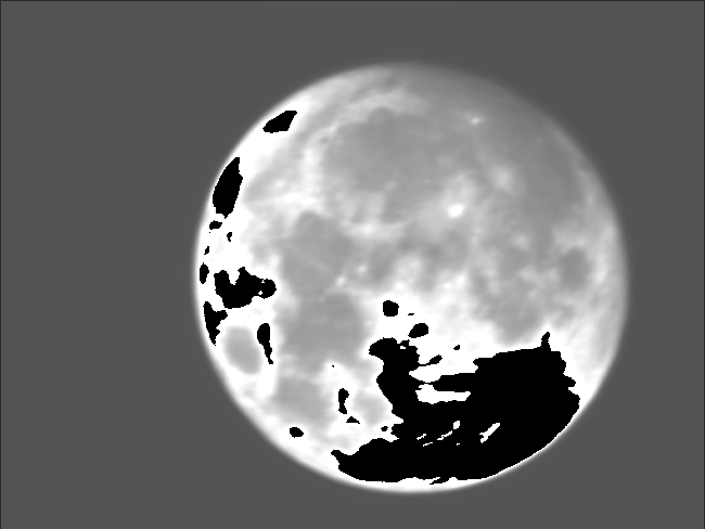 Moon: Since the Moon was full and obsquearing almost every star, I decided to try the Moon again. The results were even worse than before. At first I thought the black areas were overexposed, but later I noticed they appear to be represented incorrectly in the format I was using. The raw images should be reviewed to see what really happened. The drizzle results were less than exciting. I don't think their software can track a "spot", only stars, which it doesn't do that well. |