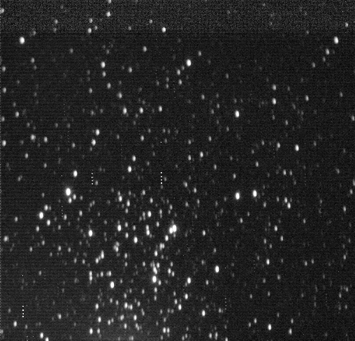 Above is a drizzle of CYMG raw images - pretty good results, considering the image should be converted to luminosity before being drizzled. Below is an individual CYMG raw uncombined image - of course, at the time, I didn't realize that and was very happy I was getting images that I could recognize. I presume the results of using process 2 on these raw images would produce better results. Mouse over to compare star patterns to the reference image below. CYMG raw uncombined image: