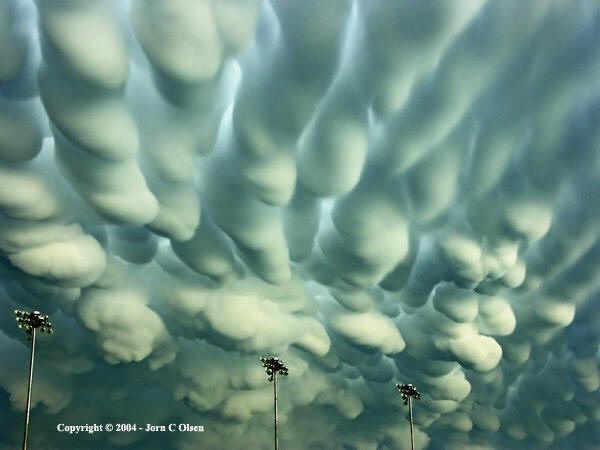 Ever see anything like this? Jorn Olsen {the photographer} works for the Dutton {or is that Mutton?} Um lights are at the Hastings College stadium just east of his home. {Hastings College is located in Hastings, Nebraska.} The clouds are called Mammatus clouds . They do not precede a tornado, or foretell a storm, but are formed when the air is already saturated with rain droplets and/or ice crystals and begins to sink. The worst of the storm is usually over when these kinds of clouds are seen.